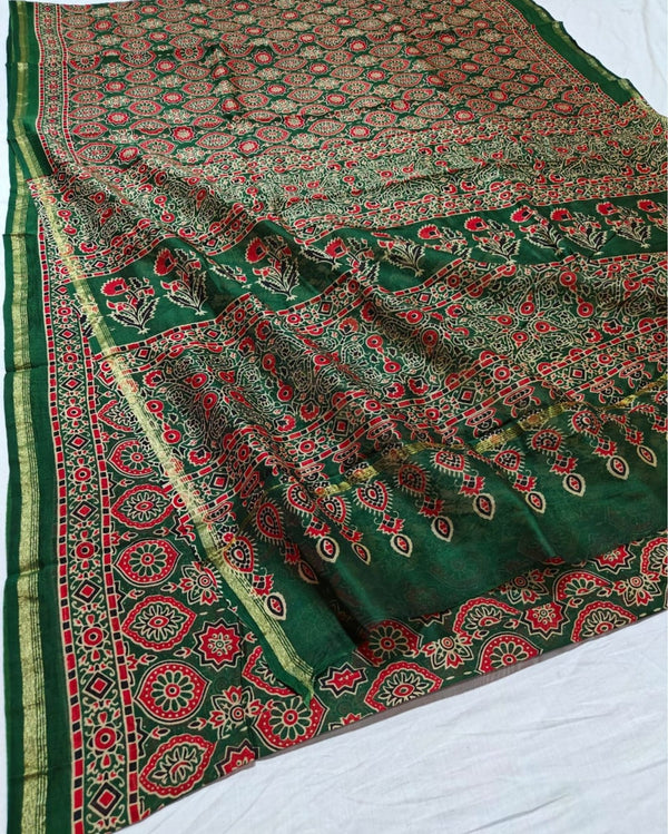 Elegant Chanderi Silk Saree featuring traditional Ajrakh Printing. Lightweight, breathable, and perfect for festive occasions or cultural events. A timeless blend of heritage craftsmanship and contemporary charm for your wardrobe.