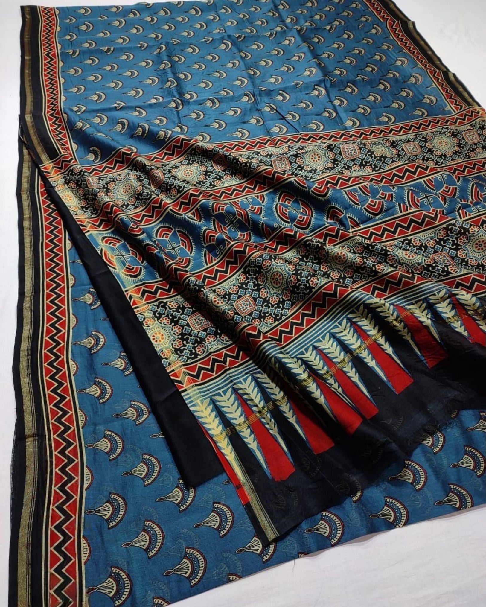 Ajrakh Printed Arapawa Blue Chanderi Silk Saree
