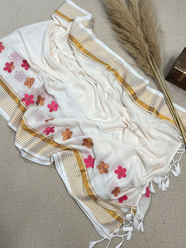Elegant pure mul cotton by cotton handloom saree adorned with intricate machine embroidery work. ... Read more