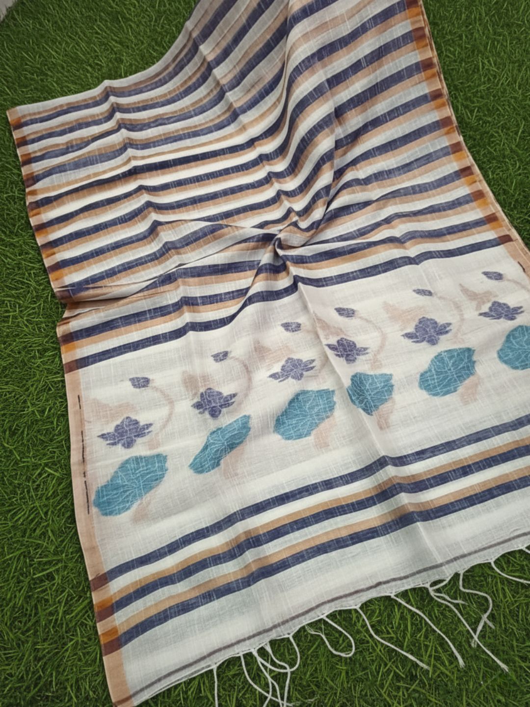 Exquisite pure linen by linen handloom saree featuring intricate all-over hand weaving work. Lightweight, breathable, and elegant — perfect for festive occasions, casual gatherings, or sophisticated everyday wear.