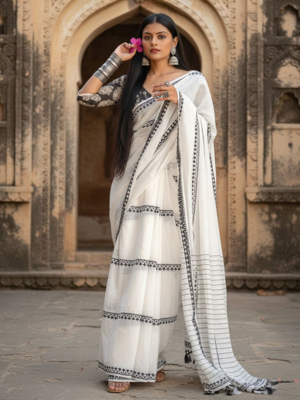 Handloom weaving involves interlacing threads manually on a loom to create patterns, textures, or motifs directly into the fabric. This traditional technique gives the saree a unique, artisanal texture and aesthetic that is impossible to replicate with machines.