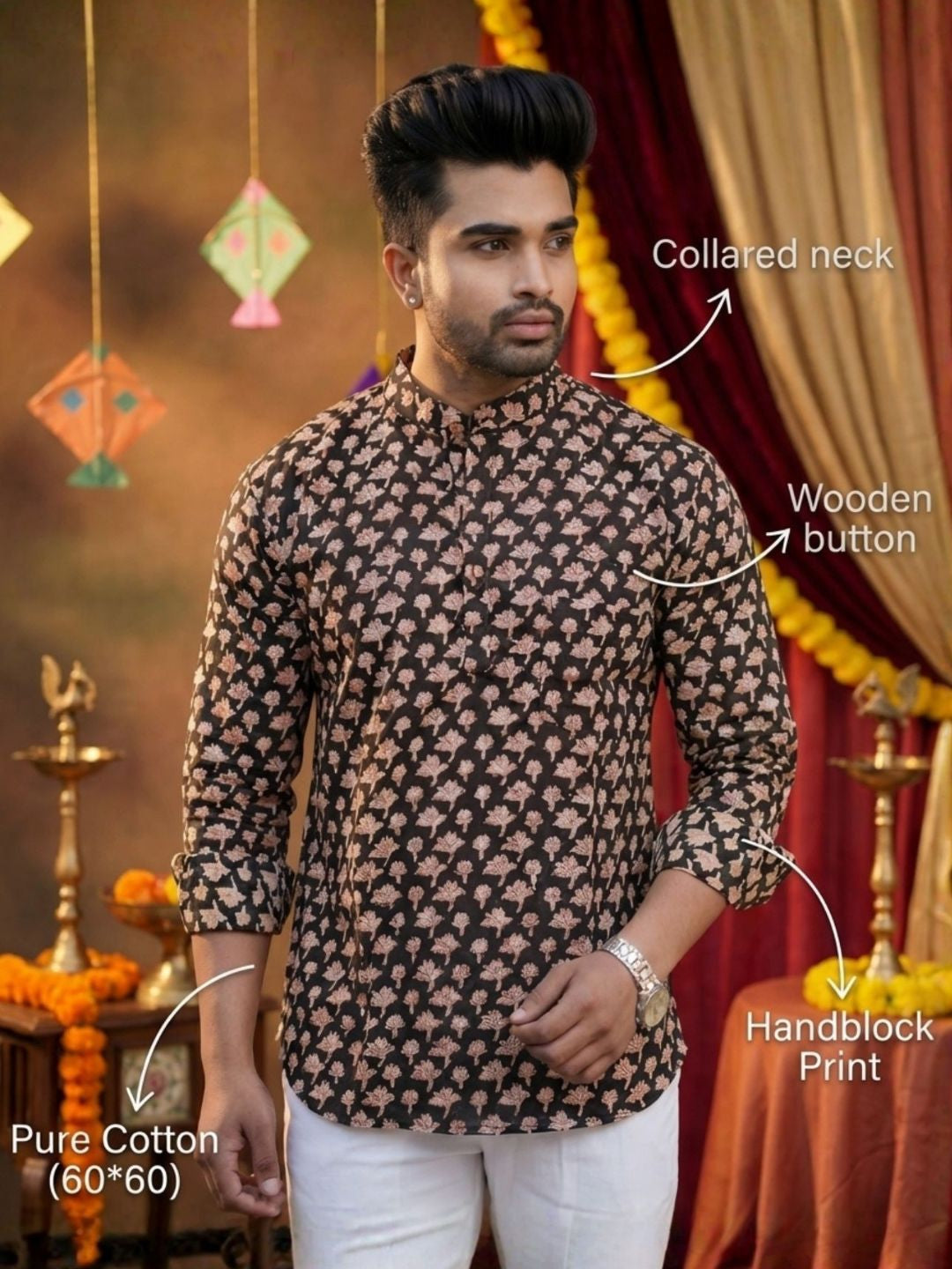 Pure cotton (60×60) short kurta featuring traditional handblock prints. Soft, breathable, and comfortable, ideal for daily wear, casual outings, or relaxed festive moments with ethnic simplicity.