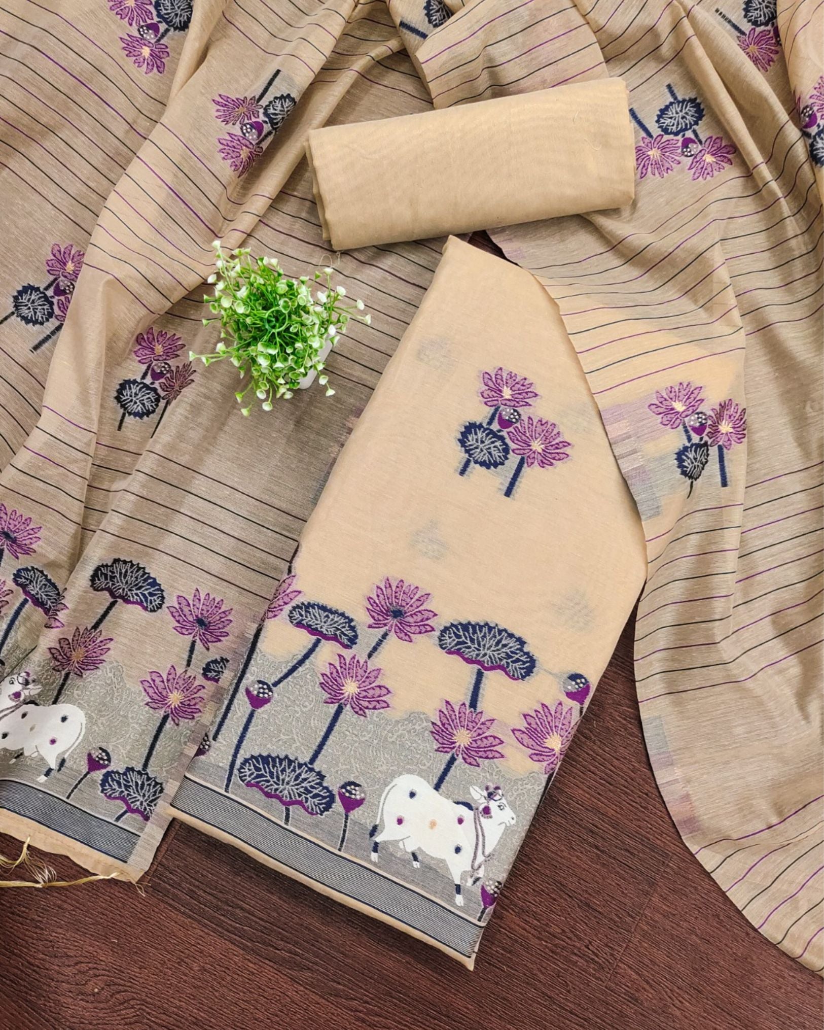 The suit is made by skilled weavers using traditional handlooms in Banaras. Artisans interlace cotton threads with brocade (zari) threads to form detailed patterns like floral vines, paisleys, or traditional motifs. The process is slow and intricate, requiring precision and artistry.