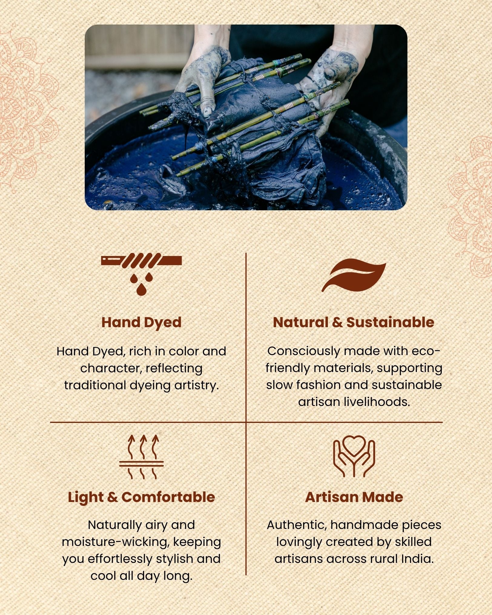 **Hand Dyed** refers to the traditional technique of coloring fabric manually using natural or synthetic dyes. Each piece is individually immersed, tied, dipped, or brushed to achieve unique color patterns. This artisanal process results in subtle variations and rich, organic tones, making every hand-dyed textile distinct and full of character.