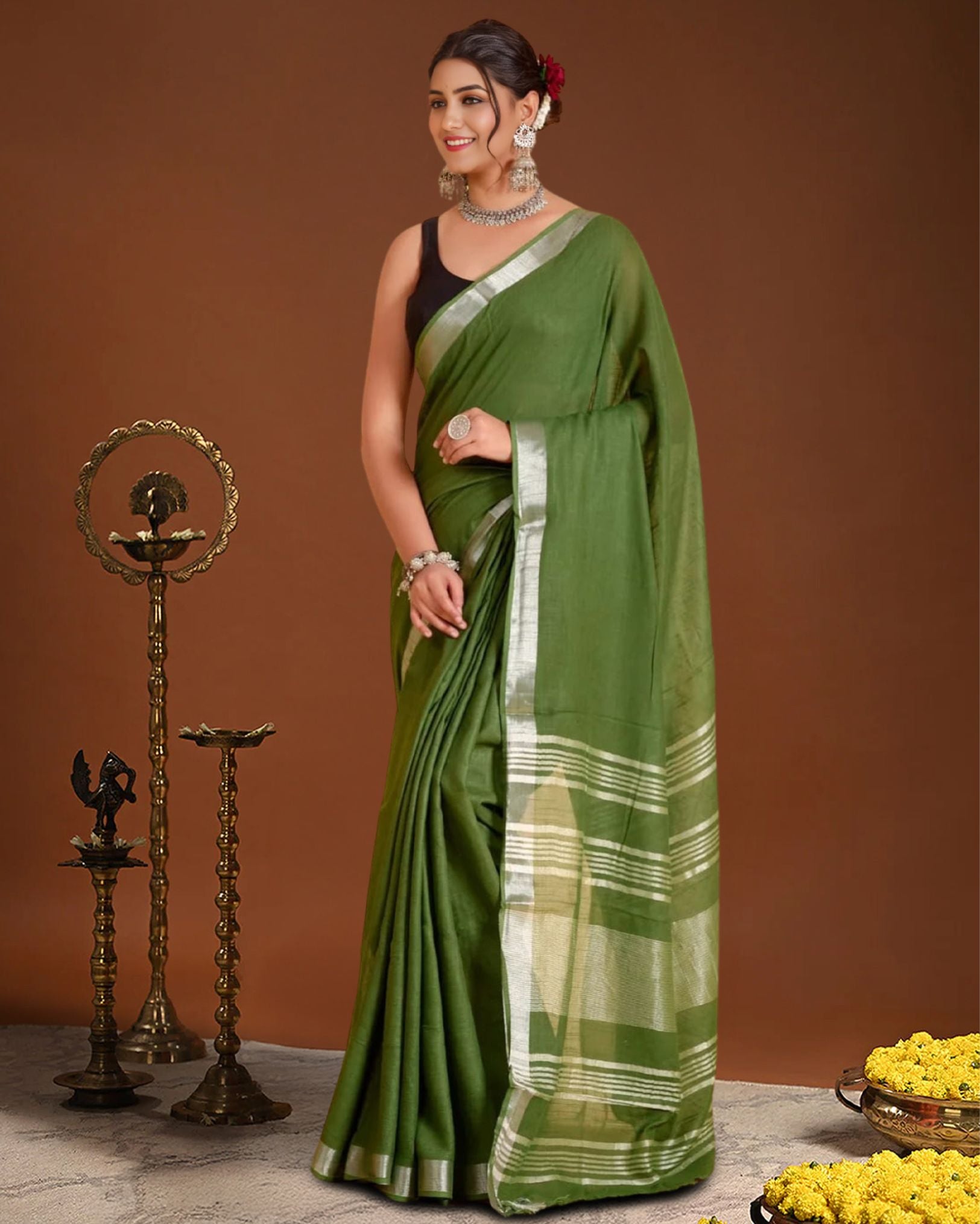 Elegant hand-dyed linen saree featuring a stylish striped pallu. Lightweight, breathable, and perfect for everyday elegance or festive charm. A blend of tradition and modernity for the contemporary woman.