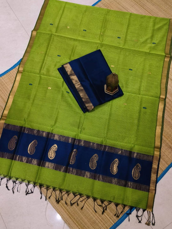 It is a handwoven traditional suit crafted from cotton silk blend fabric, adorned with an elegant zari border and decorated with Kairi (paisley) buta motifs. This combination creates a graceful ethnic look, perfect for festive, cultural, and semiformal occasions.