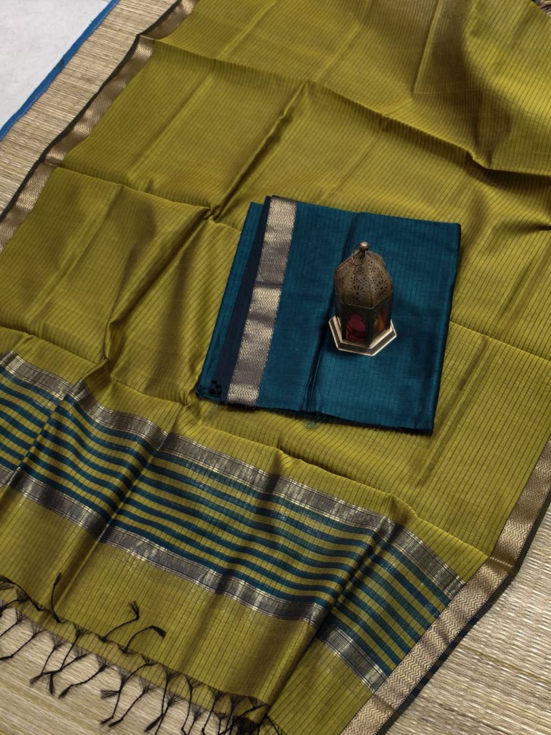 **Maheshwari Cotton Silk** is a luxurious blend of cotton and silk, handwoven in Maheshwar, Madhya Pradesh. Renowned for its lightweight texture, sheen, and durability, it features reversible borders, intricate zari or thread motifs, and traditional patterns. This fabric combines the comfort of cotton with the elegance of silk, perfect for festive wear.