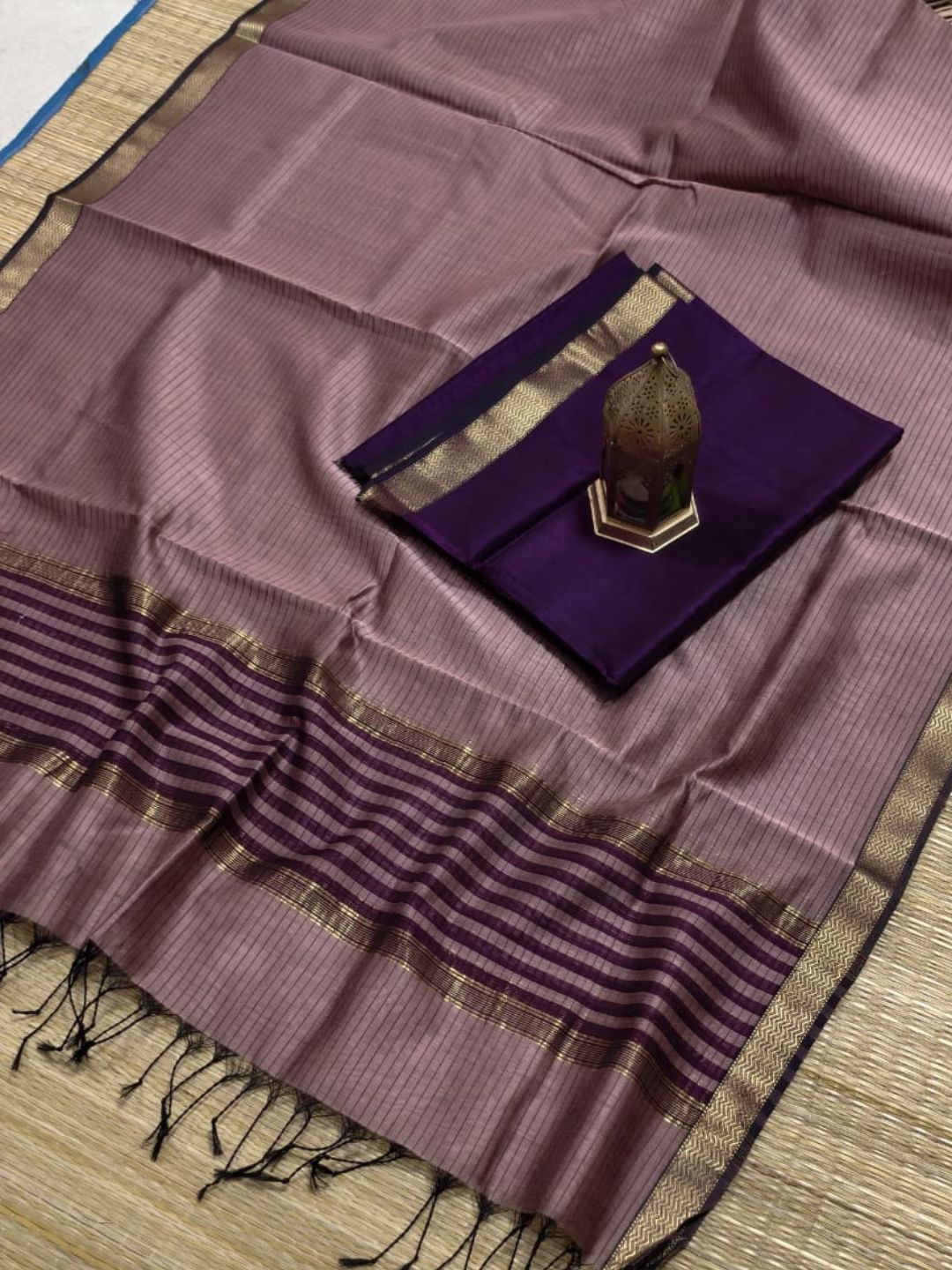 **Maheshwari Cotton Silk** is a luxurious blend of cotton and silk, handwoven in Maheshwar, Madhya Pradesh. Renowned for its lightweight texture, sheen, and durability, it features reversible borders, intricate zari or thread motifs, and traditional patterns. This fabric combines the comfort of cotton with the elegance of silk, perfect for festive wear.