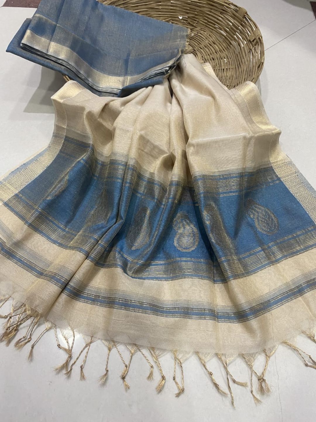 **Maheshwari Tissue Silk** is a luxurious handwoven fabric from Maheshwar, Madhya Pradesh, blending silk with metallic zari threads to create a shimmering, translucent texture. Known for its lightweight elegance and lustrous finish, it often features stripes, checks, or floral motifs. This fabric symbolizes traditional artistry while offering sophistication for festive and bridal wear.