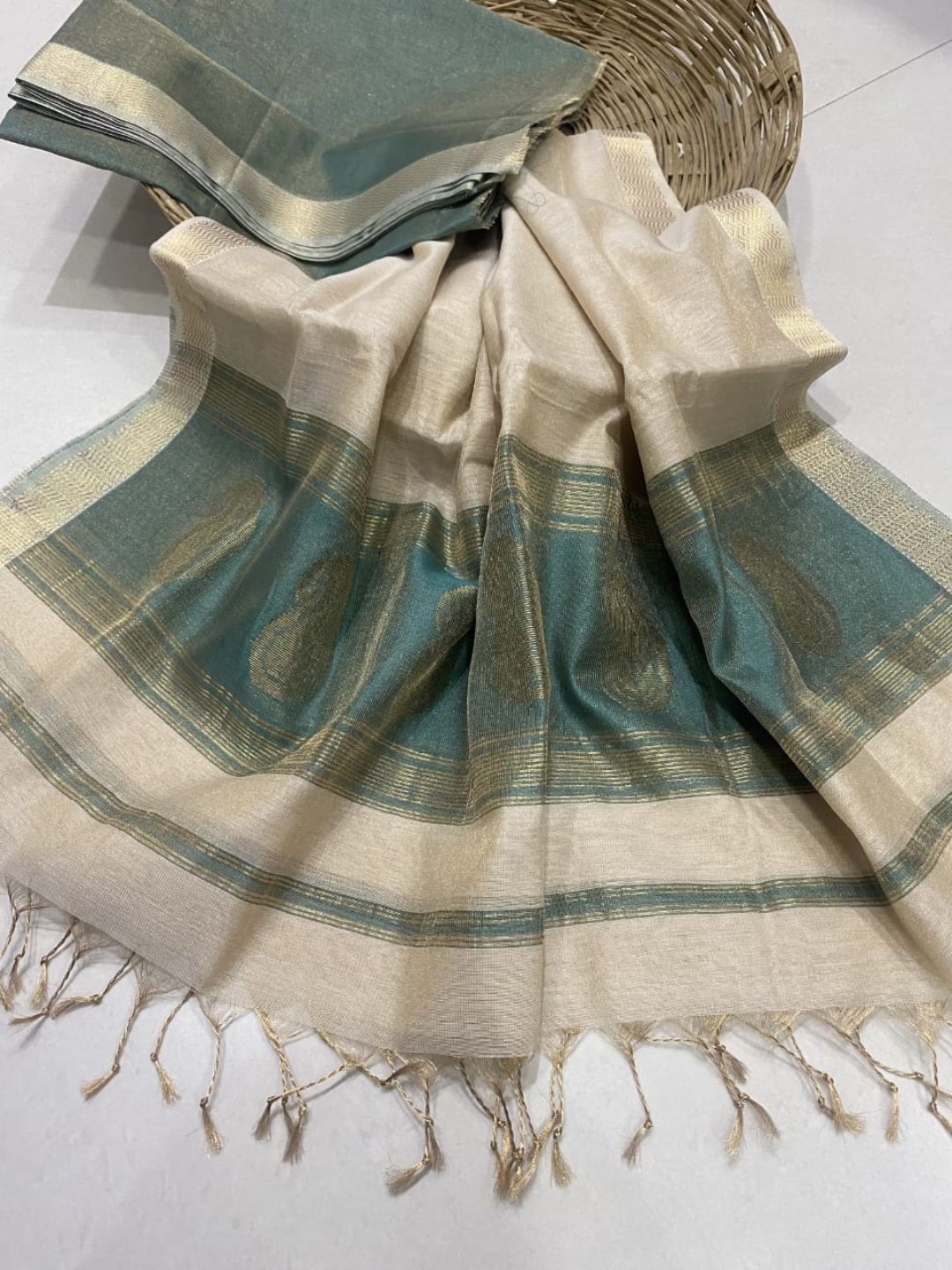 **Maheshwari Tissue Silk** is a luxurious handwoven fabric from Maheshwar, Madhya Pradesh, blending silk with metallic zari threads to create a shimmering, translucent texture. Known for its lightweight elegance and lustrous finish, it often features stripes, checks, or floral motifs. This fabric symbolizes traditional artistry while offering sophistication for festive and bridal wear.