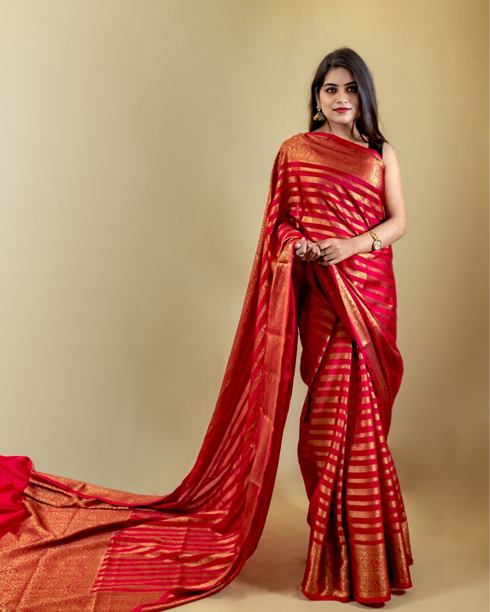 Buta weaving refers to the process of creating small, decorative motifs (often floral or paisley) using zari (metallic threads) or silk threads during the weaving of the fabric. These butas are spaced evenly or in specific layouts, giving the saree a timeless appeal.