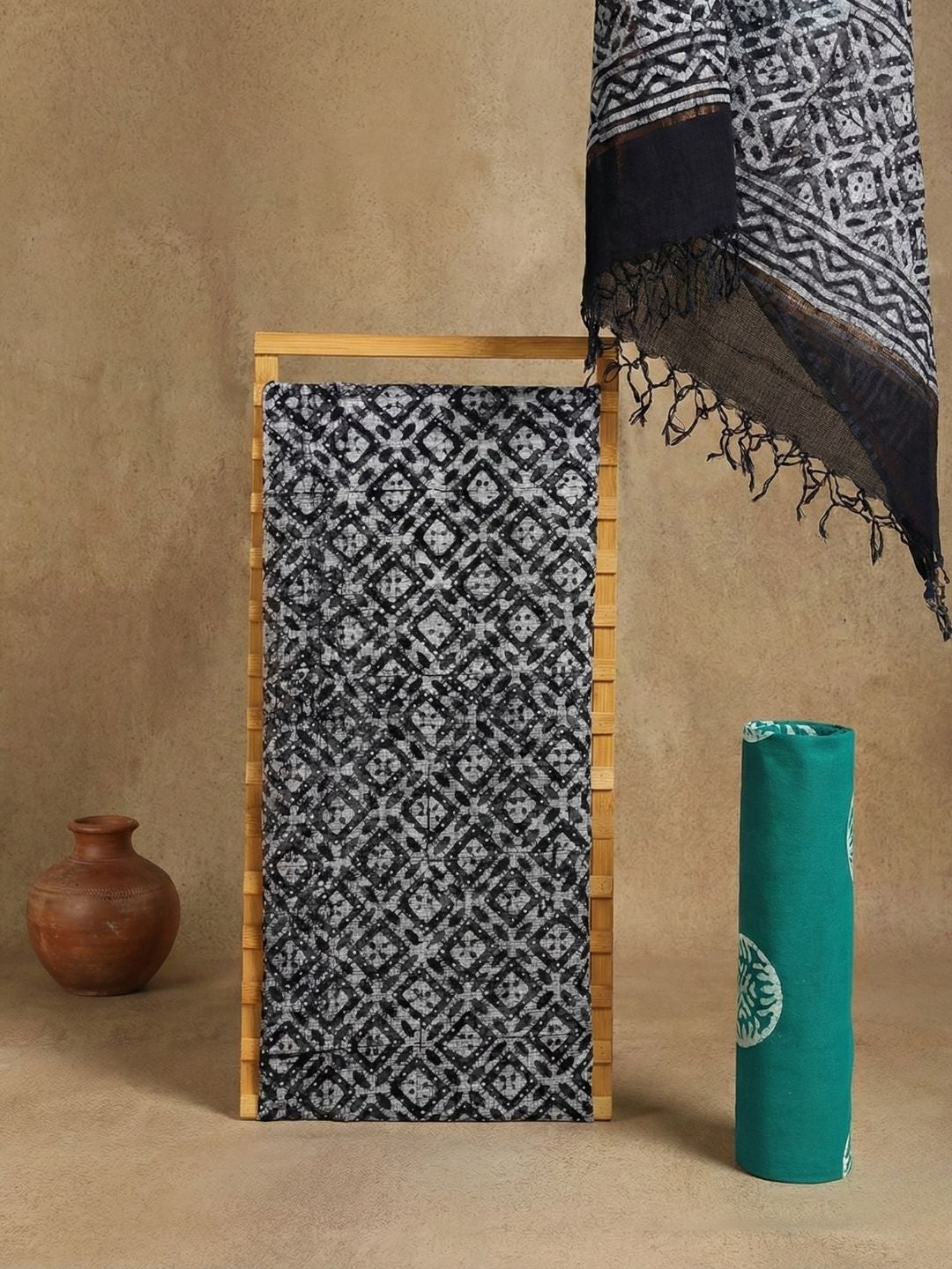 A Pure Cotton Kota Doria Wax Batik Suit is a lightweight ethnic set made from handwoven Kota Doria cotton and decorated with hand wax batik patterns. The suit offers airy comfort with artistic detailing, making it suitable for daily and occasion wear.