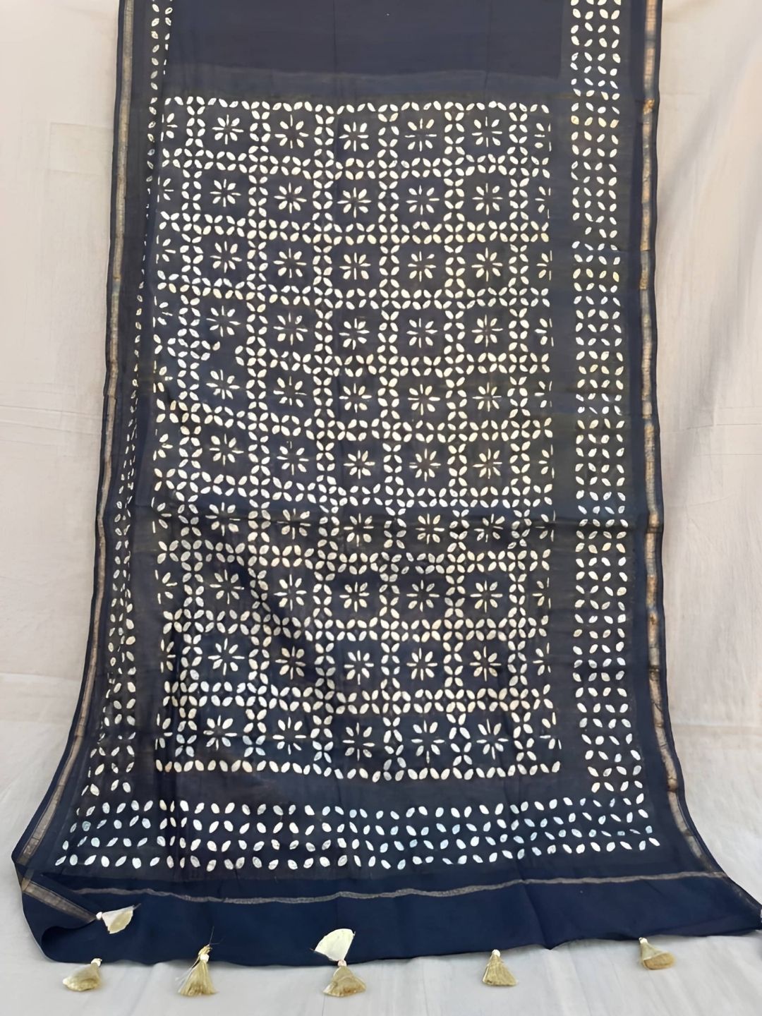 **Appliqué** is a decorative technique where pieces of fabric are stitched onto a base fabric to form patterns or motifs. You get layered designs, textured detail, and strong visual contrast, often used in ethnic wear, sarees, and home textiles.