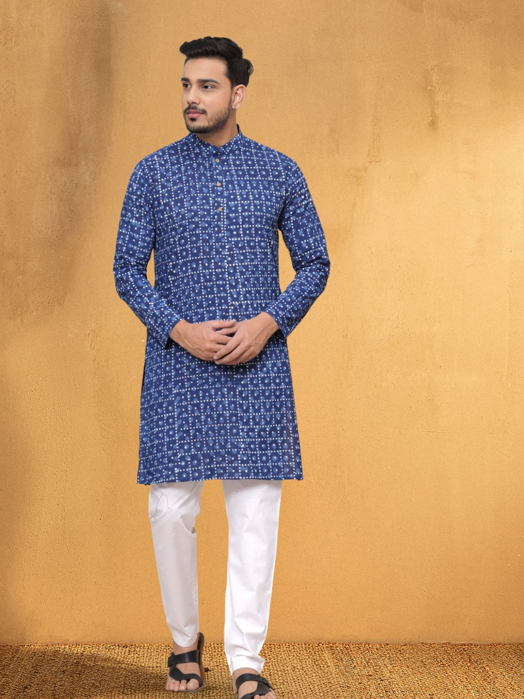 A Cotton Designer Men's Kurta Handblock Printed is a traditional Indian garment for men, crafted from cotton fabric and adorned with intricate handblock printing. It features unique patterns and designs created using wooden blocks.