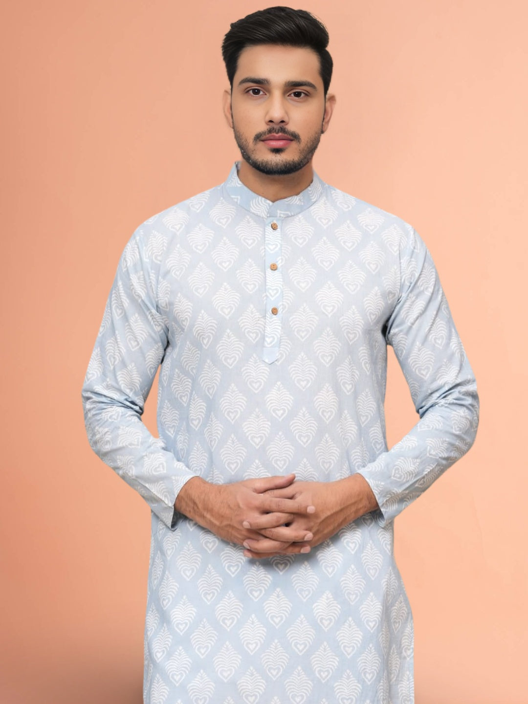A Cotton Designer Men's Kurta Handblock Printed is a traditional Indian garment for men, crafted from cotton fabric and adorned with intricate handblock printing. It features unique patterns and designs created using wooden blocks.