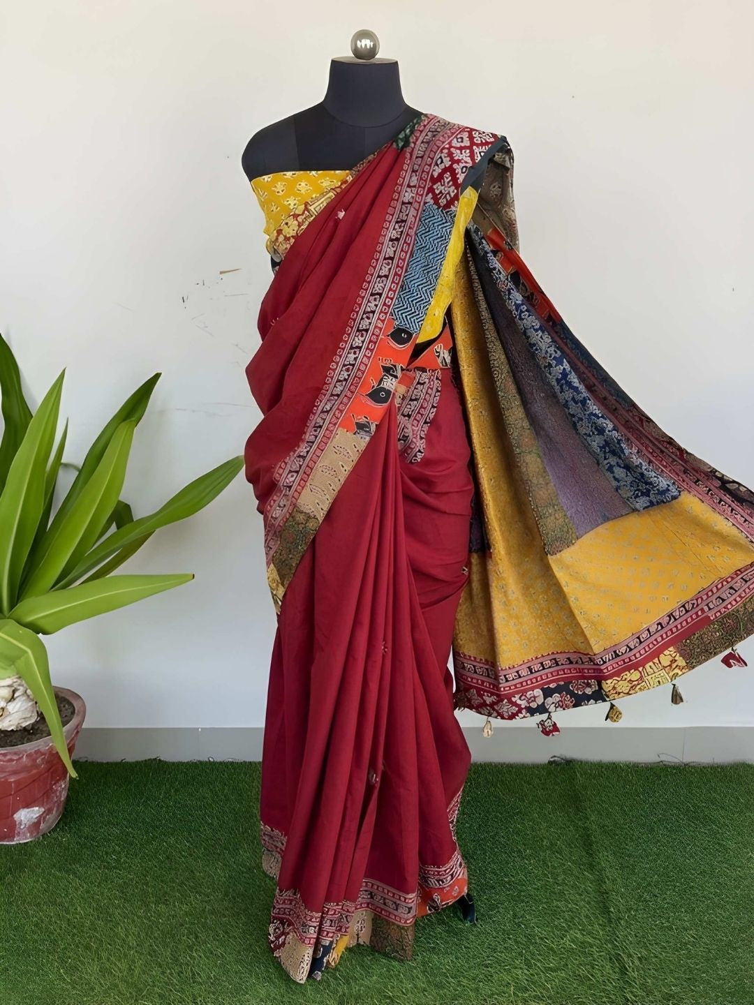 Pure mul cotton saree featuring detailed Kantha embroidery with patch and mirror work. Soft, breathable, and lightweight, ideal for festive gatherings, cultural events, or elegant everyday wear.