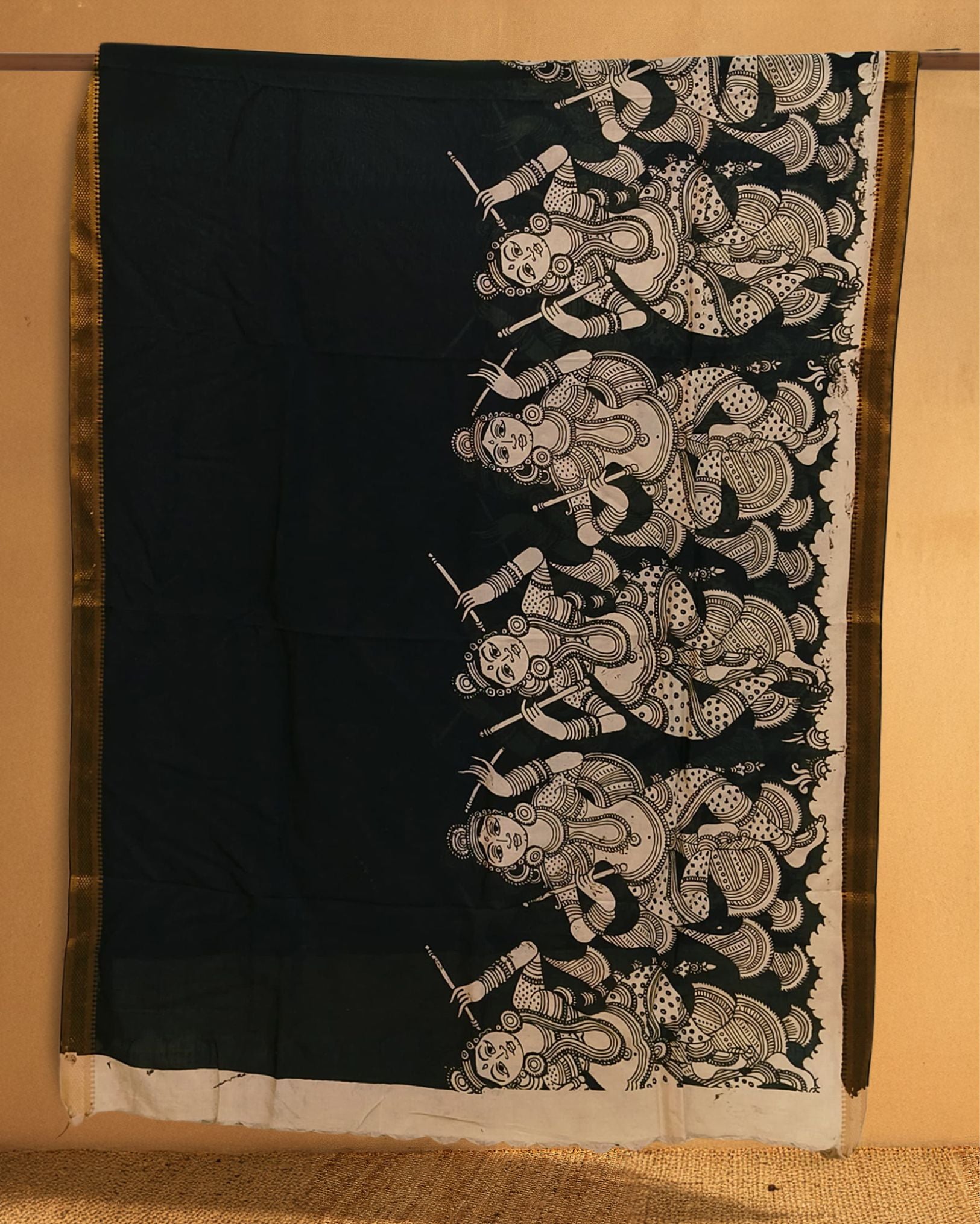 The dupatta is first woven from smooth Bangalori silk. Then, artists carefully sketch and paint motifs directly onto the fabric using special fabric paints or natural dyes. The dupatta is heat-set or steamed afterward to fix the colors, making the artwork long-lasting.