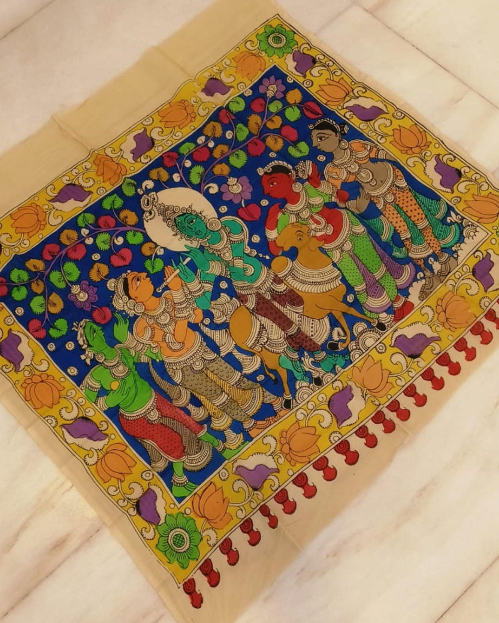 A symphony of colors dances on Bangalori silk, each brushstroke a tale, weaving dreams into a vivid tapestry of art.