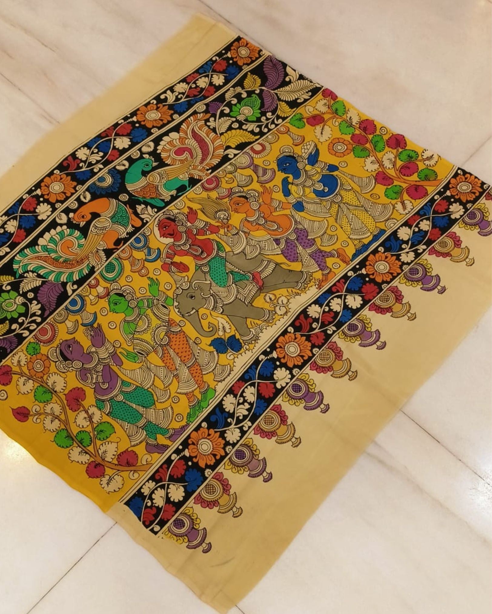 A symphony of colors dances on Bangalori silk, each brushstroke a tale, weaving dreams into a vivid tapestry of art.