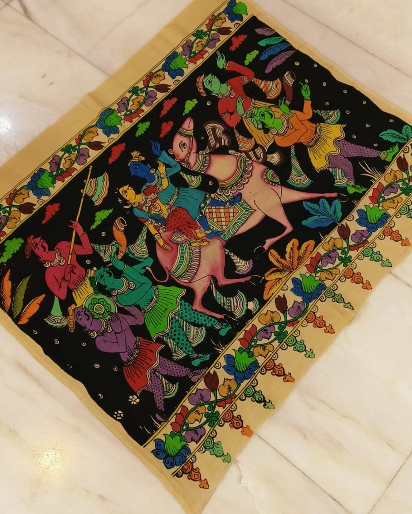 A symphony of colors dances on Bangalori silk, each brushstroke a tale, weaving dreams into a vivid tapestry of art.