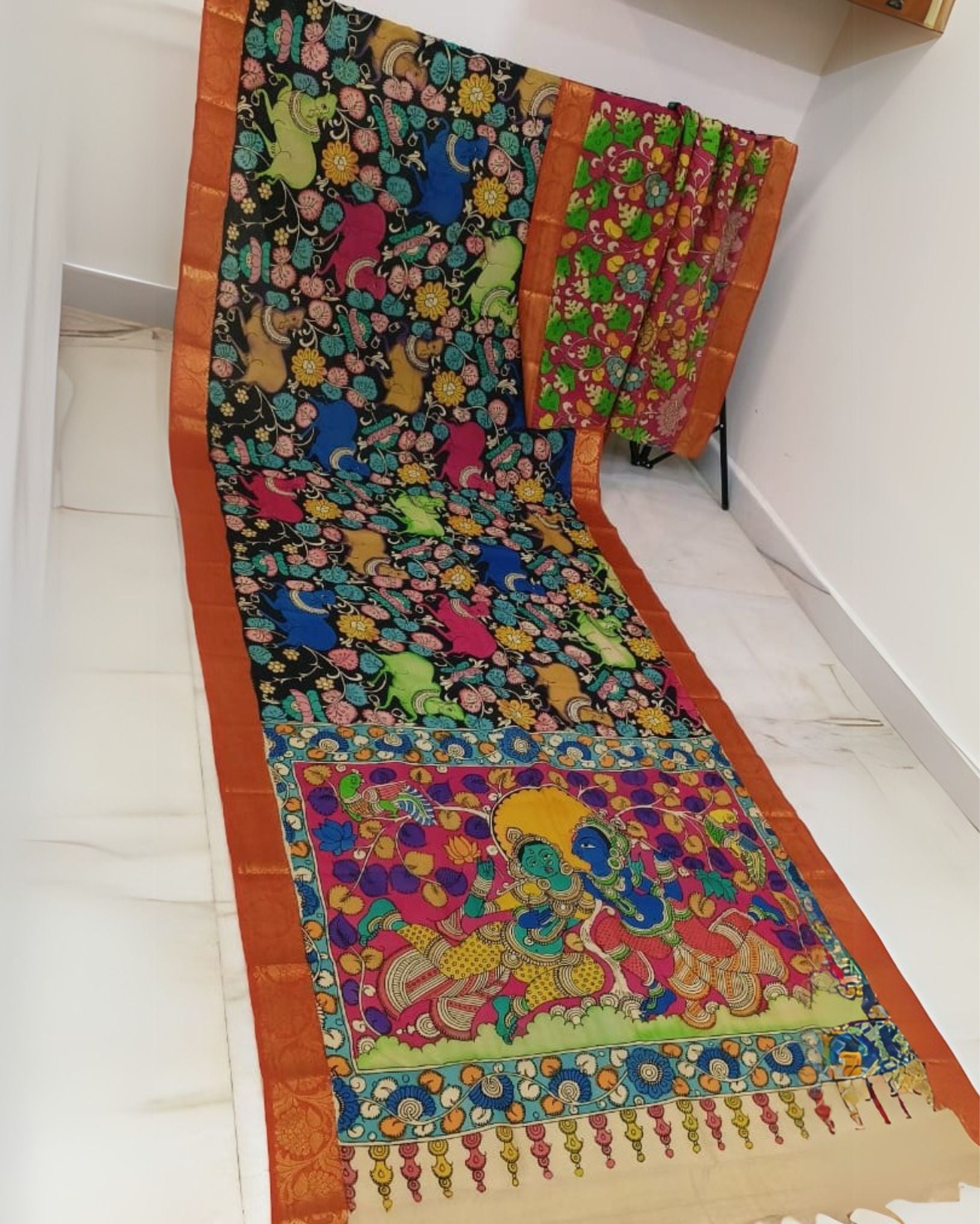 Exquisite Mangalagiri handpainted and hand-drawn sarees, showcasing intricate artistry on premium... Read more