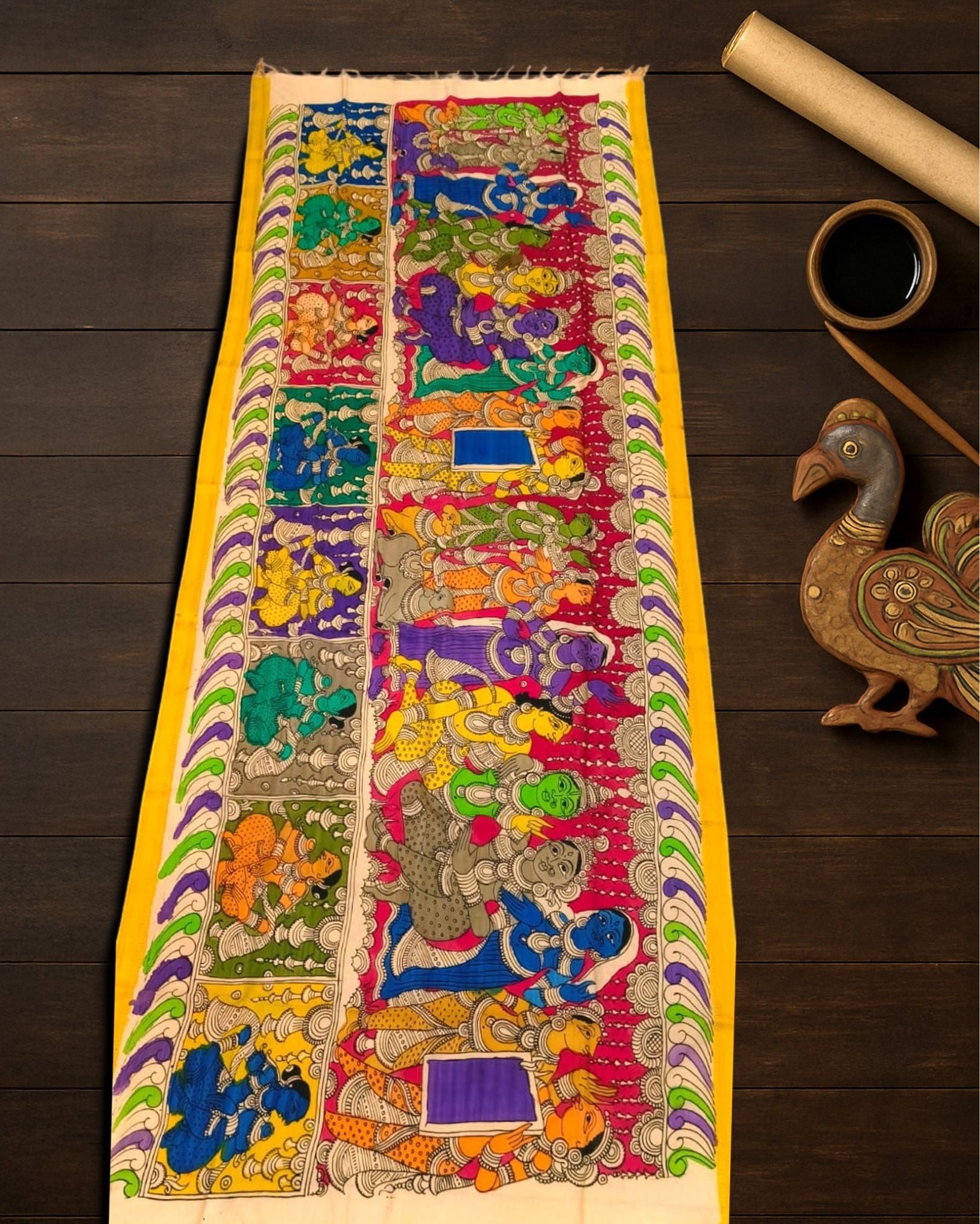 The dupatta is first made from Mangalagiri silk, known for its lightweight and durable texture. Skilled artisans then paint intricate designs by hand using special fabric dyes or paints. After the painting process, the fabric is set to ensure the colors don’t fade or bleed, preserving the vibrant designs.