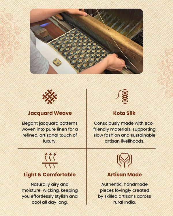 Experience luxury with our Handcrafted Kota Silk Jacquard Saree. Intricately woven with Jacquard patterns on fine Kota silk fabric, each saree offers opulence and sophistication, perfect for making a statement at any event.