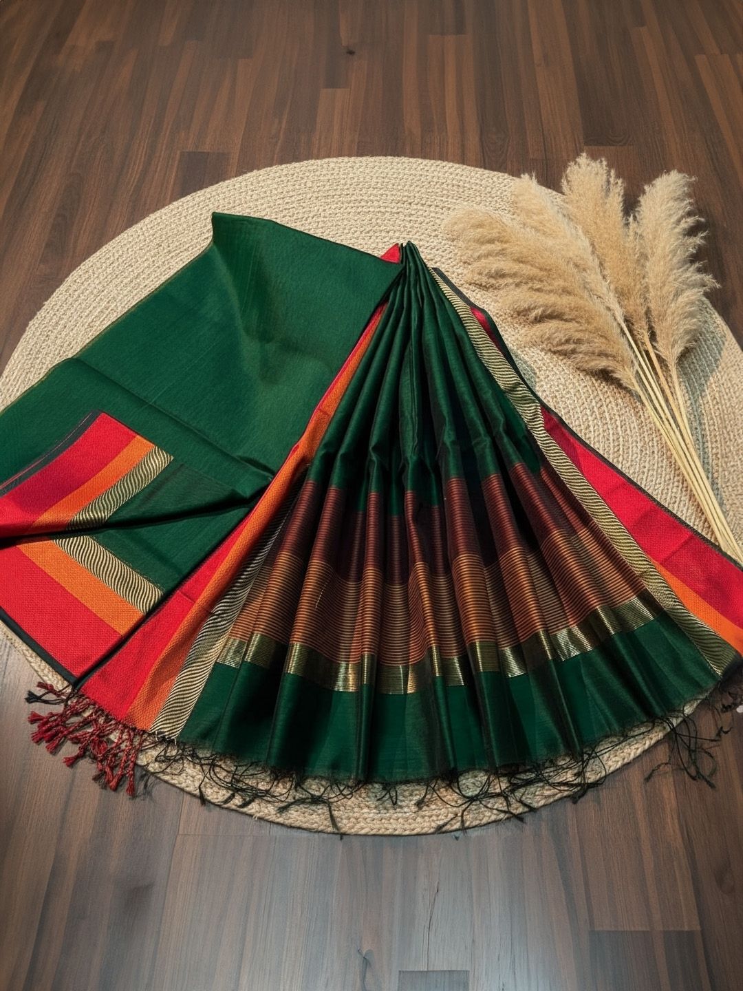 **Maheshwari Silk** is a traditional handwoven fabric from Maheshwar, Madhya Pradesh, known for its luxurious texture and lightweight feel. It blends silk and cotton, offering both shine and comfort. Characterized by intricate zari borders, reversible designs, and geometric or floral motifs, Maheshwari Silk sarees exude timeless grace and royal elegance.
