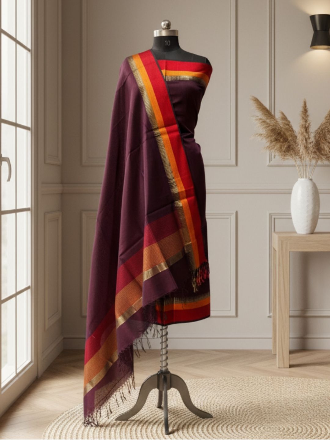 A Maheshwari Silk Zari Weaving Suit is an elegant ethnic ensemble crafted from fine Maheshwari silk, featuring intricate zari weaving patterns. Known for its lightweight texture, graceful drape, and subtle sheen, this suit is perfect for festive, wedding, and special occasions.